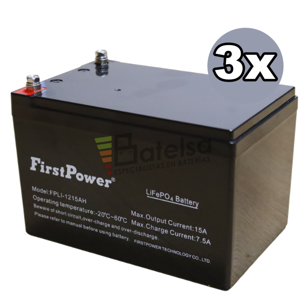 Pack de 3 Baterías Litio 12 Voltios 15 Amperios FirstPower FPLI12-15ah LiFePO4 para Silla de movilidad.