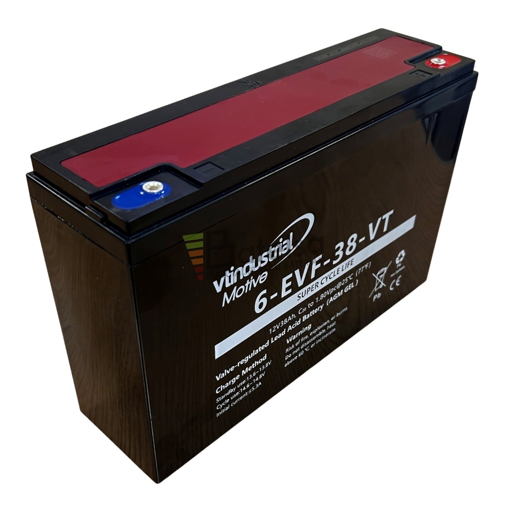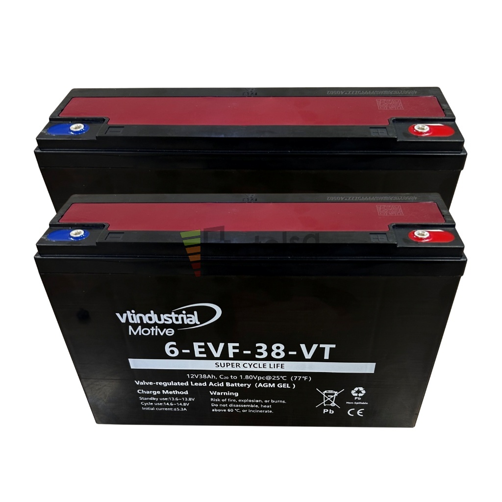 Conjunto de 2 baterías VT Motive 6-EVF-38 especial vehículos y maquinaria de tracción eléctrica, 12 voltios 38 Amperios Híbridas Ciclo Profundo .