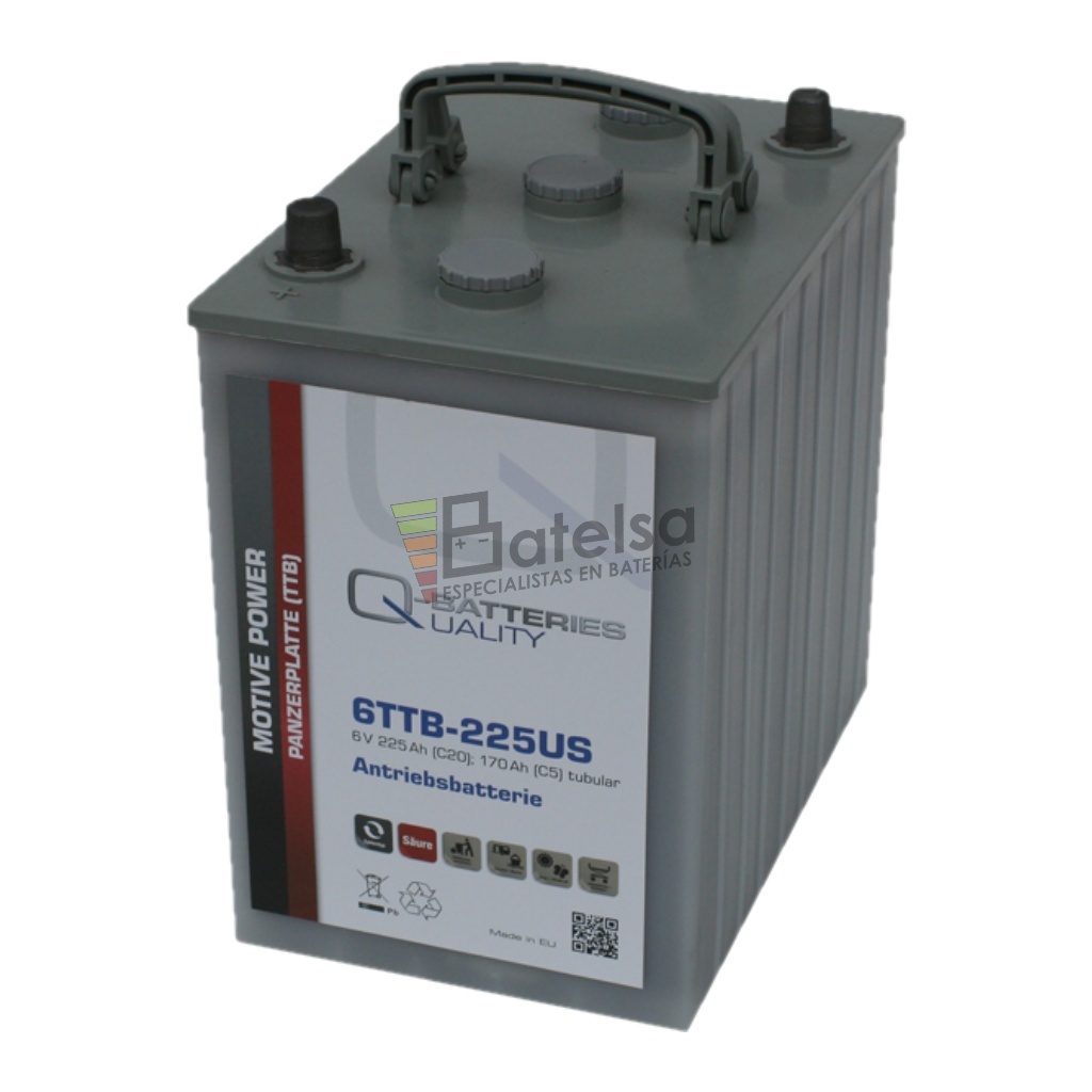Batería Qbatteries 1.200 ciclos 6TTB-225US Tubular (PzS) — 6 Voltios 225 Amperios (C20) La batería Qbatteries 6TTB-225US es una batería de plomo-ácido inundada de la serie TTB, con placas tubulares positivas (tecnología de placa blindada / PzS). Está pensada para ciclo profundo y uso exigente en aplicaciones de tracción como carros de golf, maquinaria de limpieza, plataformas elevadoras móviles y transpaletas eléctricas, ofreciendo rendimiento fiable y larga vida útil.