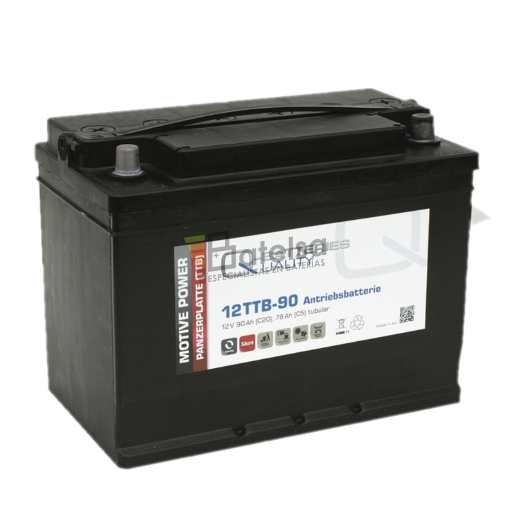 Quality-Batteries 12TTB-90 Batería de tracción — 12 Voltios 90 Amperios (C20) La batería Q-Batteries 12TTB-90 pertenece a la serie TTB, desarrollada con tecnología de placas tubulares positivas (PzS) para ofrecer máxima resistencia a descargas profundas y ciclos intensivos. Es una batería de tracción de plomo-ácido inundada, robusta y fiable, diseñada para garantizar un suministro de energía constante en aplicaciones profesionales y recreativas.