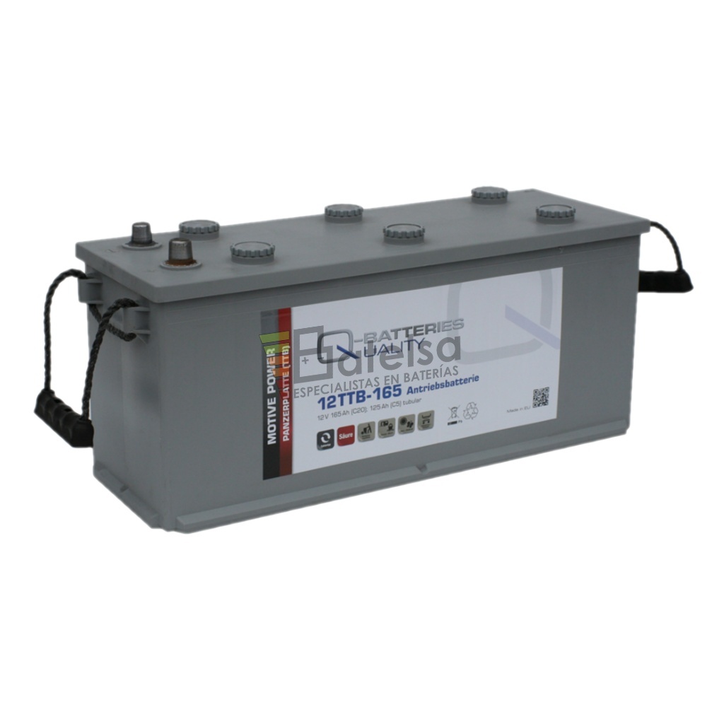 Quality-Batteries 12TTB-165 Batería de tracción — 12 Voltios 165 Amperios (C20) La batería Q-Batteries 12TTB-165 forma parte de la serie TTB y está equipada con tecnología de placas tubulares positivas (PzS) y electrolito líquido. Es una batería de tracción de ciclo profundo, diseñada para soportar descargas intensivas y prolongadas en aplicaciones industriales y profesionales. Su construcción robusta garantiza fiabilidad, seguridad y larga vida útil en condiciones de trabajo exigentes.
