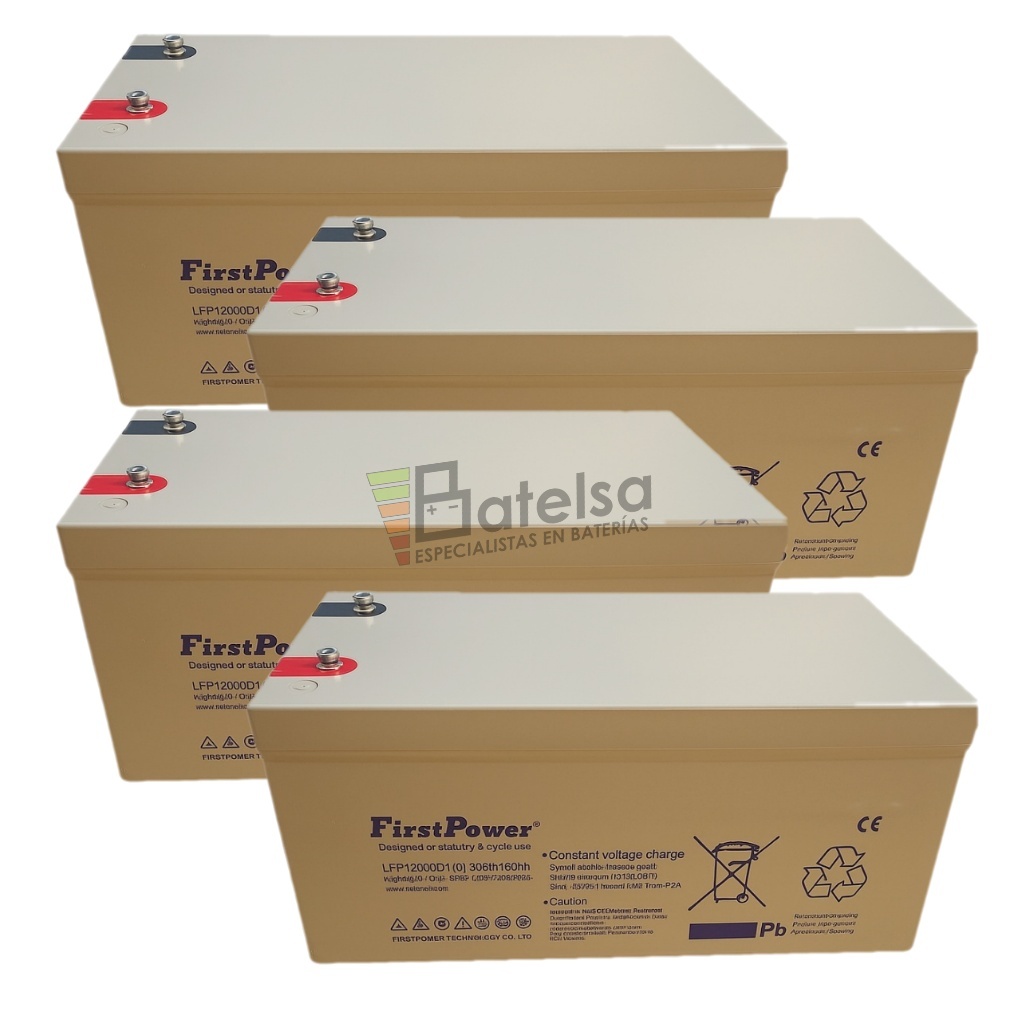 FirstPower LFP12300D — 4 Baterías VRLA AGM de 12 V • 300 Ah (C100) / 250 Ah (C10) La batería LFP12300D es una batería sellada de plomo-ácido regulada por válvula (VRLA) con Absorbent Glass Mat (AGM). Ofrece alta capacidad de descarga y una vida flotante de diseño de hasta 15 años a 20 °C, con contenedor de ABS y reconocimiento UL & CE para una operación segura y fiable en servicio continuo o cíclico.
