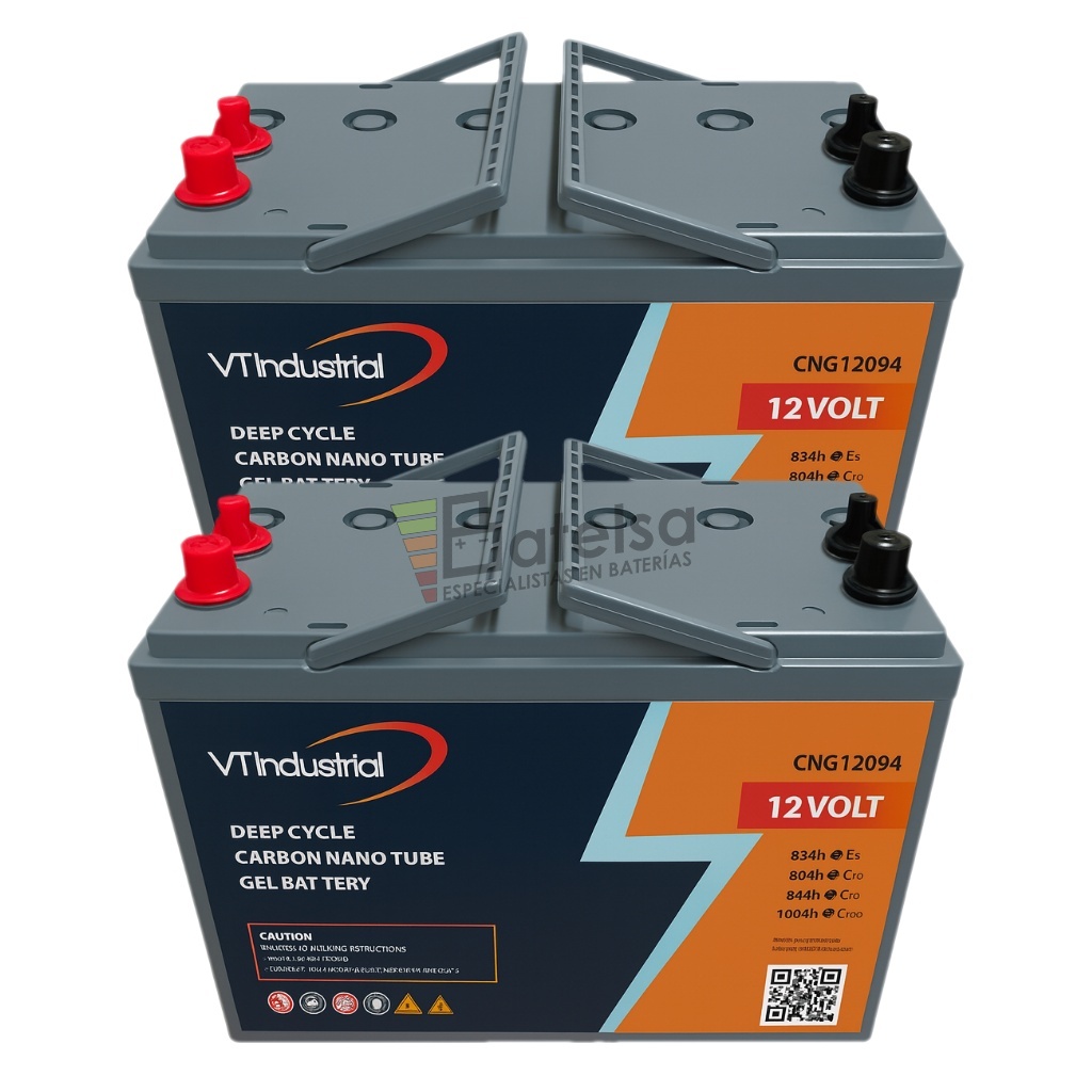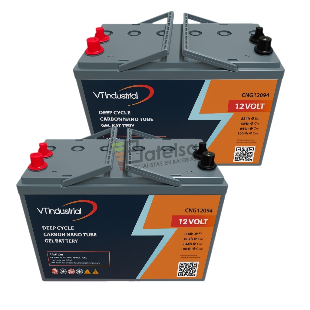 Batería CNG12094 12 Voltios 94Ah (C20) – Carbon Nano Gel Deep CycleLa batería CNG12094 forma parte de la gama profesional de baterías de ciclo profundo con tecnología Carbon Nano Gel, especialmente diseñada para aplicaciones que demandan alta durabilidad, bajo mantenimiento y un excelente rendimiento energético. Su diseño sellado y libre de mantenimiento la hace ideal para sistemas solares, vehículos eléctricos, plataformas de trabajo, telecomunicaciones y aplicaciones marinas o recreativas.