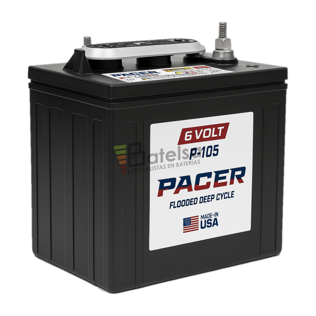 1 batería Pacer P-105 de 6 V y 220 Ah, lista para instalación en sistemas solares, industriales o de respaldo energético.