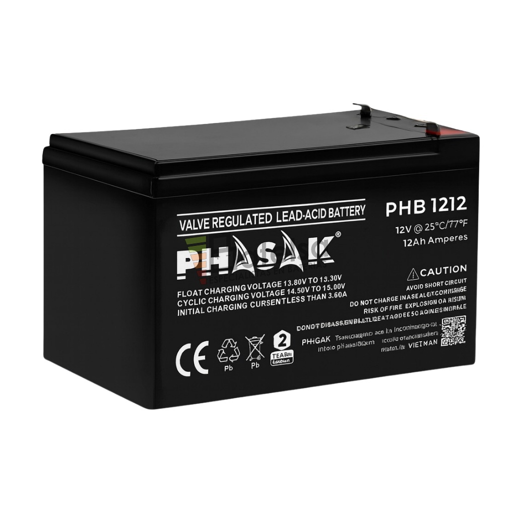 Batería Phasak PHB-1212, 12 V 12 Ah AGM (VRLA) – Energía Profesional para Respaldo y Sistemas SAI