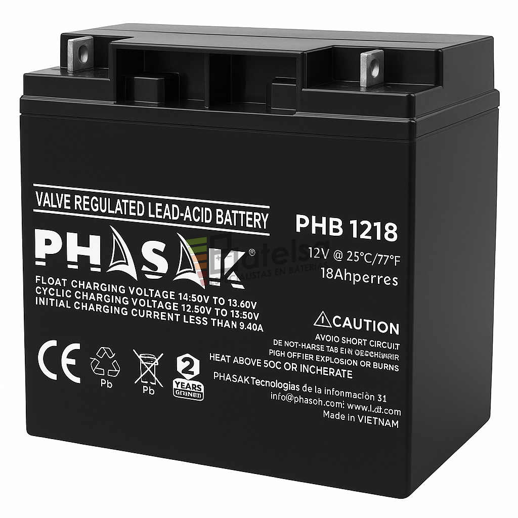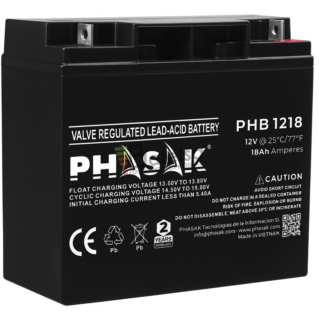 La Phasak PHB-1218 es una batería sellada de plomo-ácido con tecnología AGM (VRLA) desarrollada para ofrecer un suministro de energía seguro, estable y sin mantenimiento. Diseñada específicamente para su uso en sistemas de alimentación ininterrumpida (SAI/UPS), proporciona una autonomía superior y una excelente respuesta ante cortes eléctricos. Con una capacidad de 18 Ah y un voltaje nominal de 12 V, esta batería garantiza rendimiento prolongado y compatibilidad con una amplia gama de equipos Phasak y otros sistemas que utilicen baterías estándar de las mismas características.