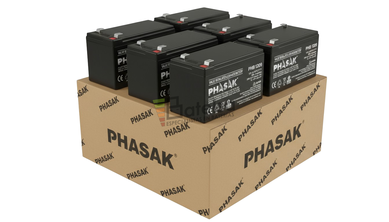 Embalaje compuesto de 6 baterías Phasak PHB-1209, 12 V 9 Ah AGM (VRLA) – Alto rendimiento para aplicaciones de alta descarga.