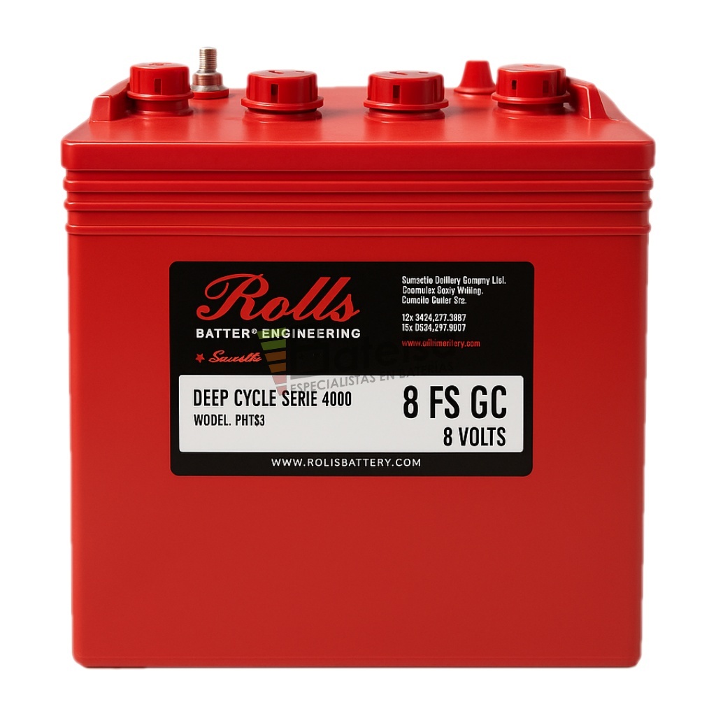 La batería Rolls 8 FS GC pertenece a la serie profesional FS de baterías de plomo-ácido inundadas de ciclo profundo, diseñadas para aplicaciones de tracción y energías renovables donde se requiere un suministro constante de energía, gran robustez mecánica y buena vida útil en ciclos profundos.