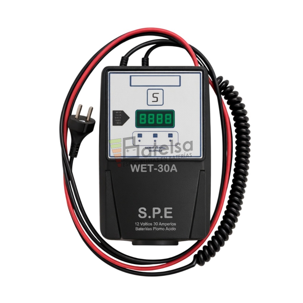 Cargador de 12 voltios 30 amperios para dos baterías Trojan J305H-AC, modelo S.P.E CBHF2 30-12 WET para baterías de plomo ácido ( Electrolito Líquido ), de 12 Voltios 30 Amperios de carga, recomendado para baterías con capacidades comprendidas entre 245 hasta 350 Amperios de capacidad nominal.