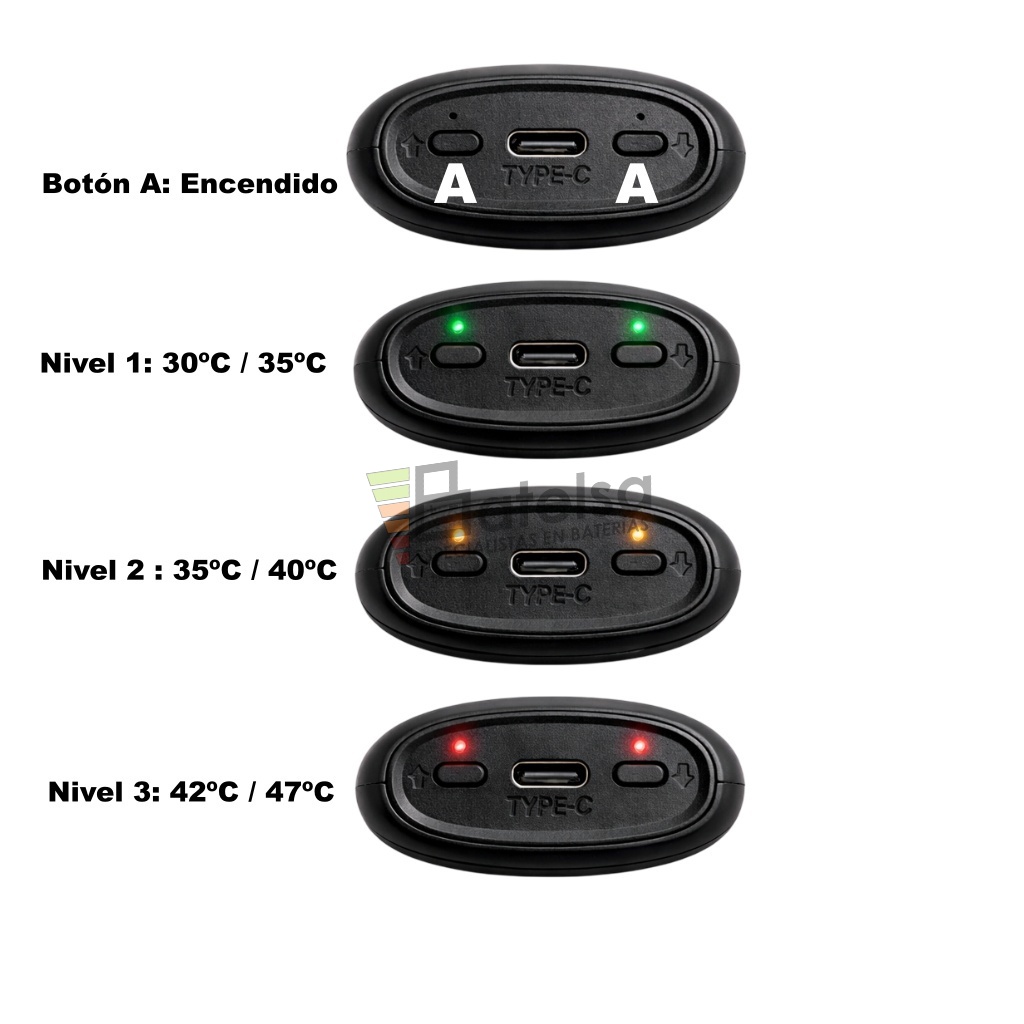 - El Power Bank tiene tres niveles de calor y para activarlos dispone de dos botones ( A ) en el frontal situados a derecha e izquierda del dispositivo como muestra la imagen adjunta, pudiendo activar la parte superior e inferior por independiente con sus tres niveles de temperatura.