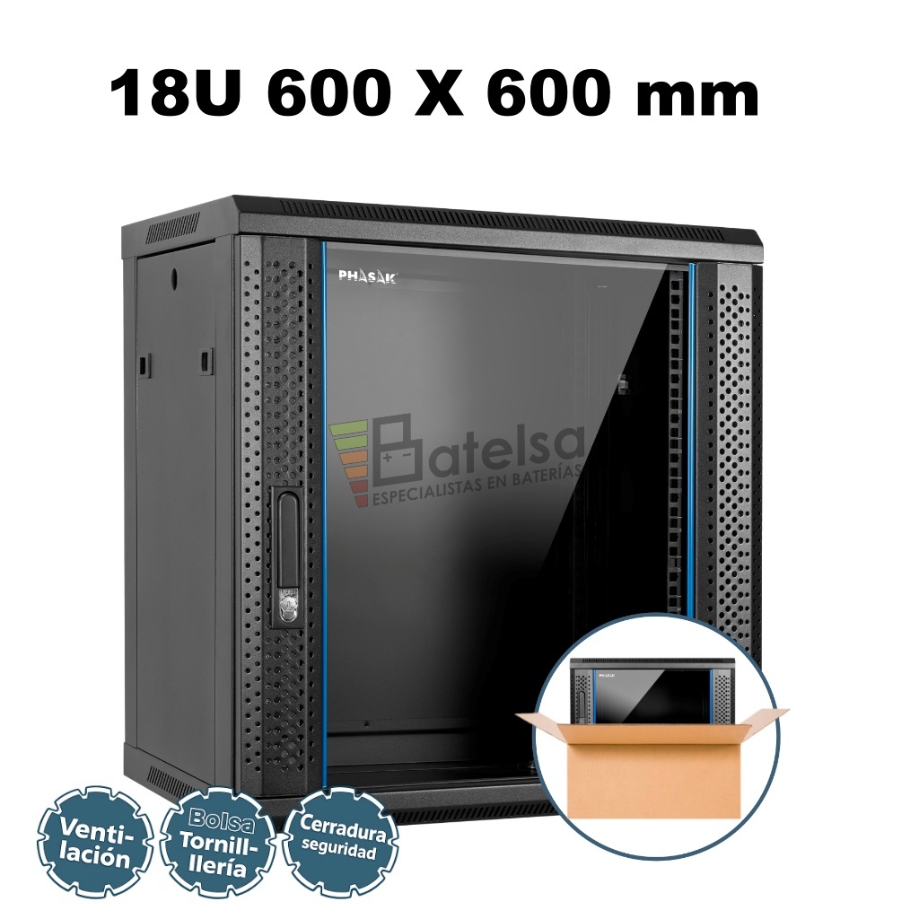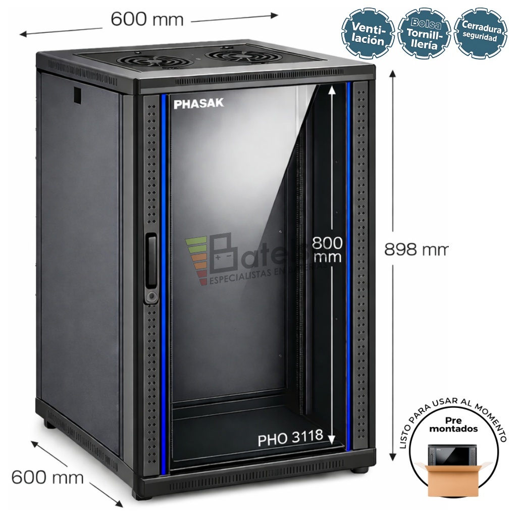 El Rack mural PHASAK Pro 19″ PHO 3118 se sirve premontado con puerta de vidrio templado, ventilación mejorada y cerradura de seguridad. Incluye bandejas y regleta 19″ para instalación profesional.