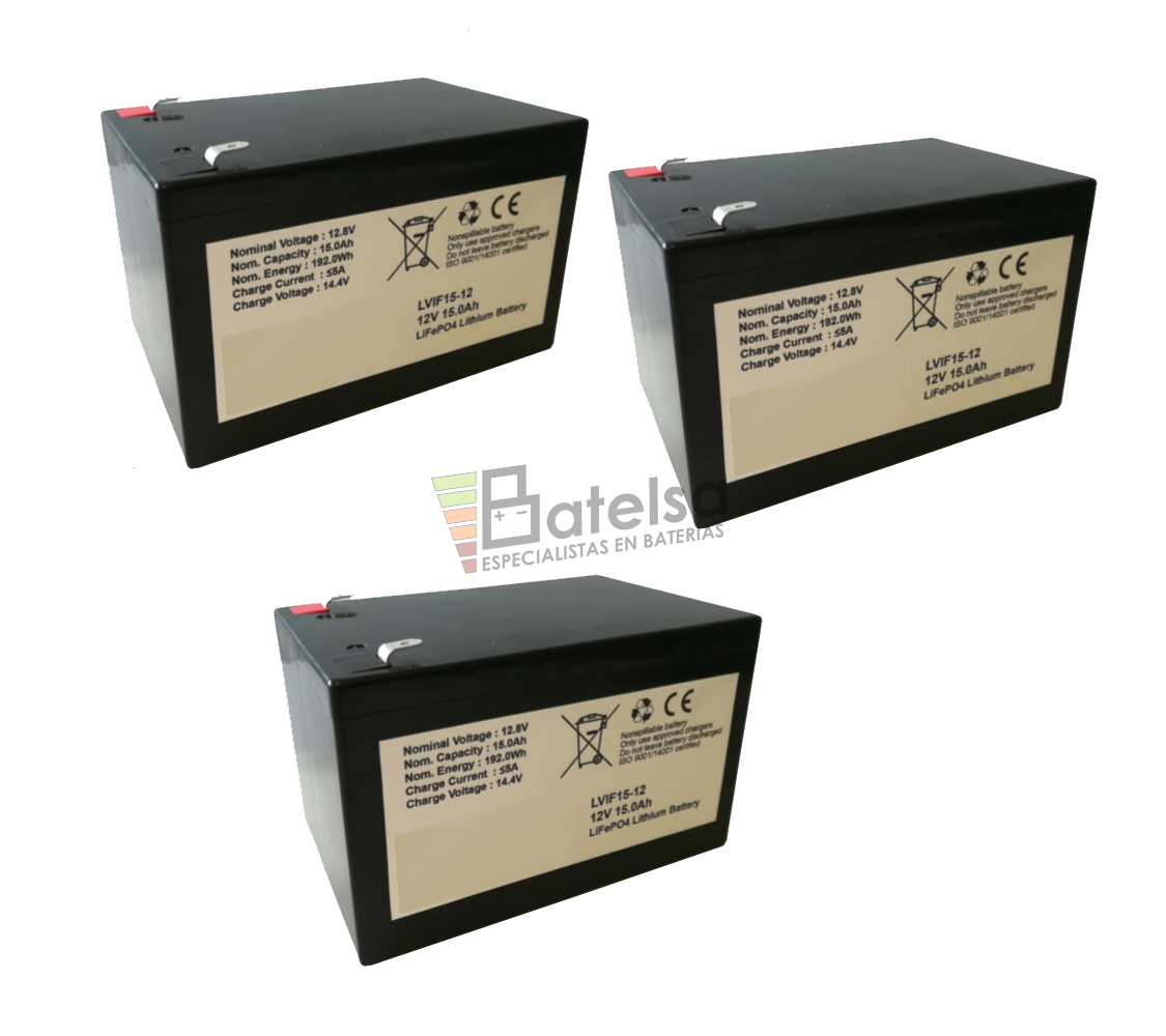 Conjunto de 3 Baterías LIFEPO4 en 12 Voltios 15 Amperios para Aplicaciones Cíclicas